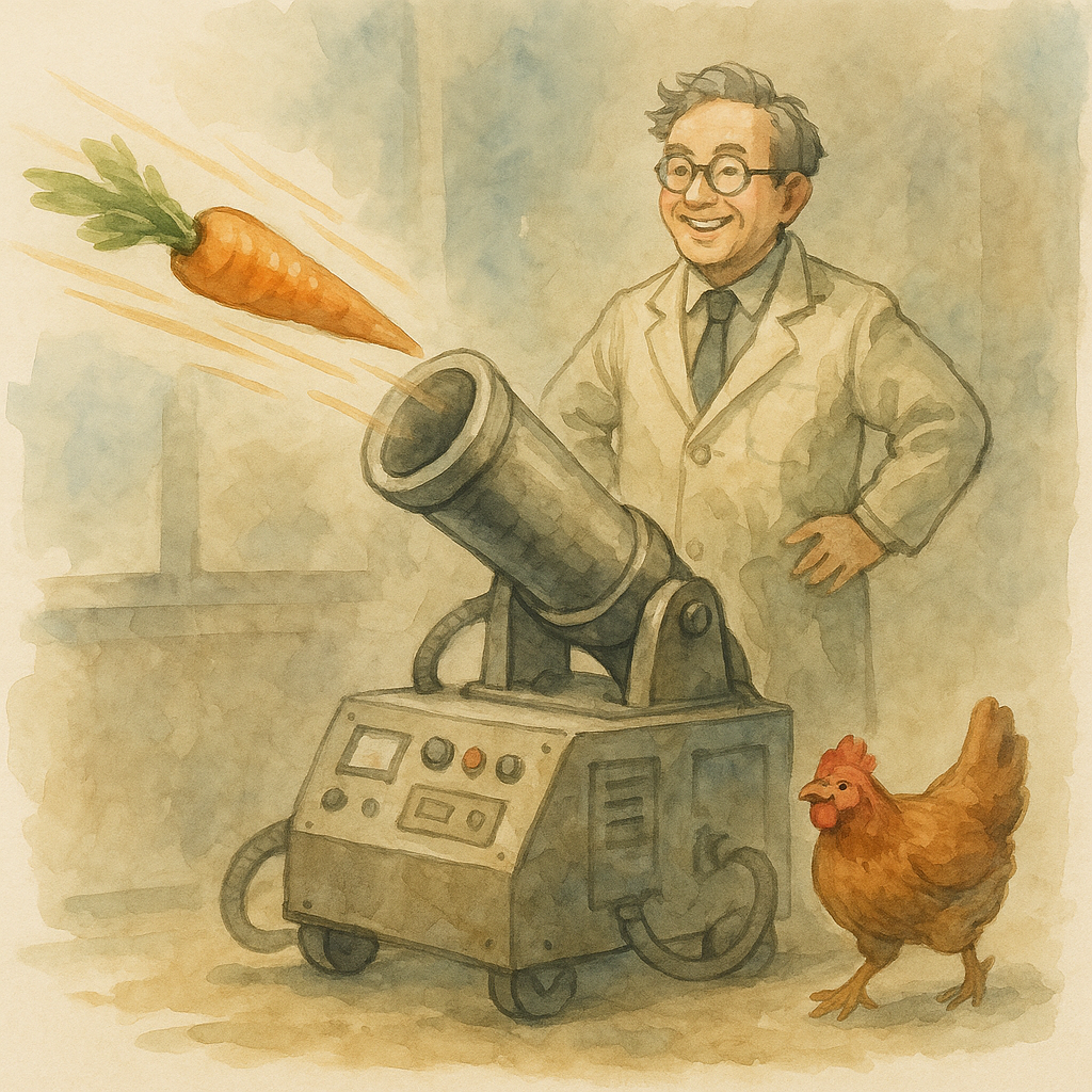NASAの技術者は、ロケットや戦闘機の風防に向かって、死んだニワトリを高速で発射する特殊装置を製作した。