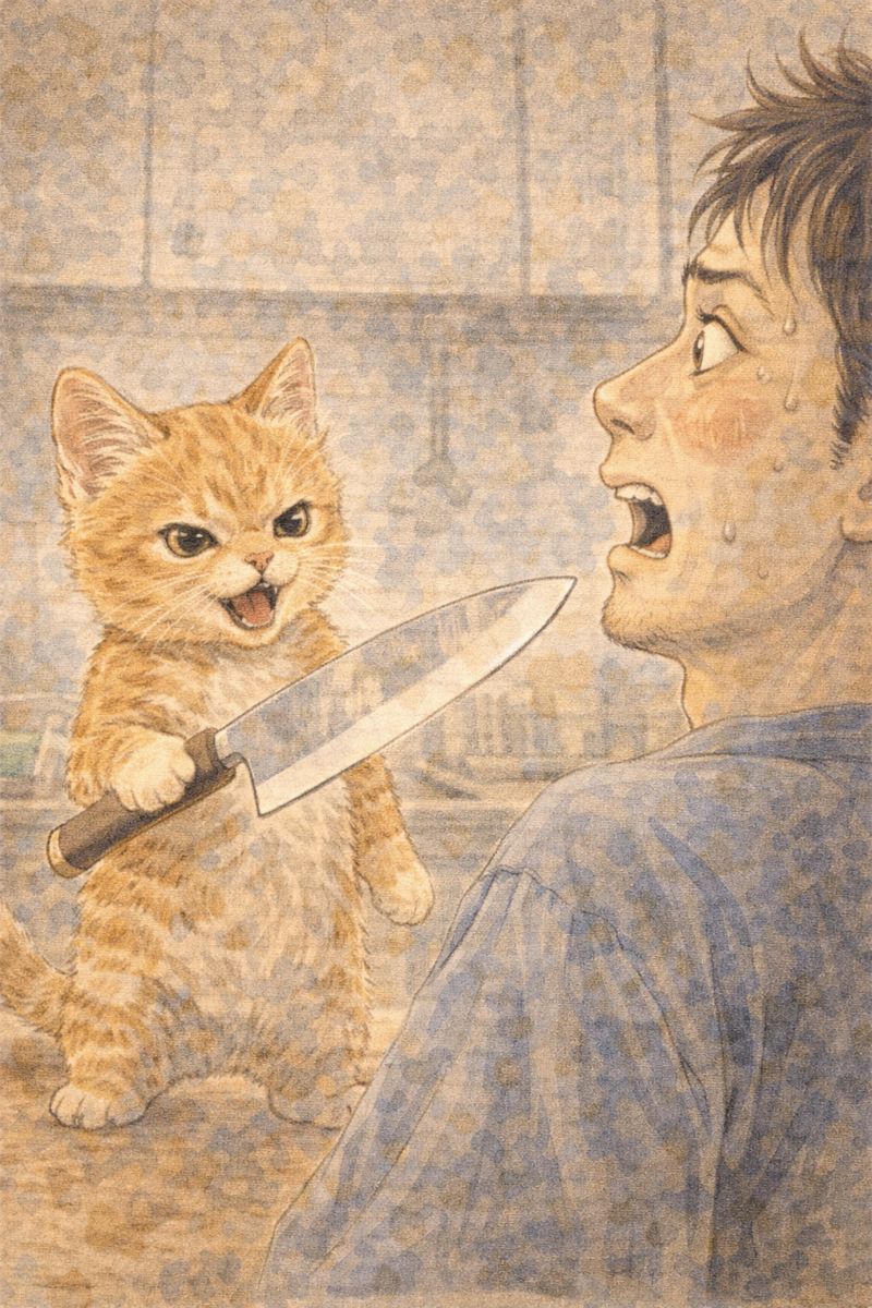 出刃包丁を持った猫が、俺に包丁を突き付けてきた。