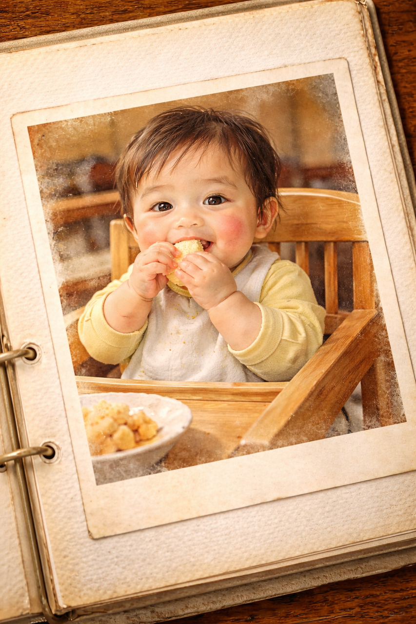 家族で撮った食事風景、生まれて間もない私への父の愛情がよくわかる。