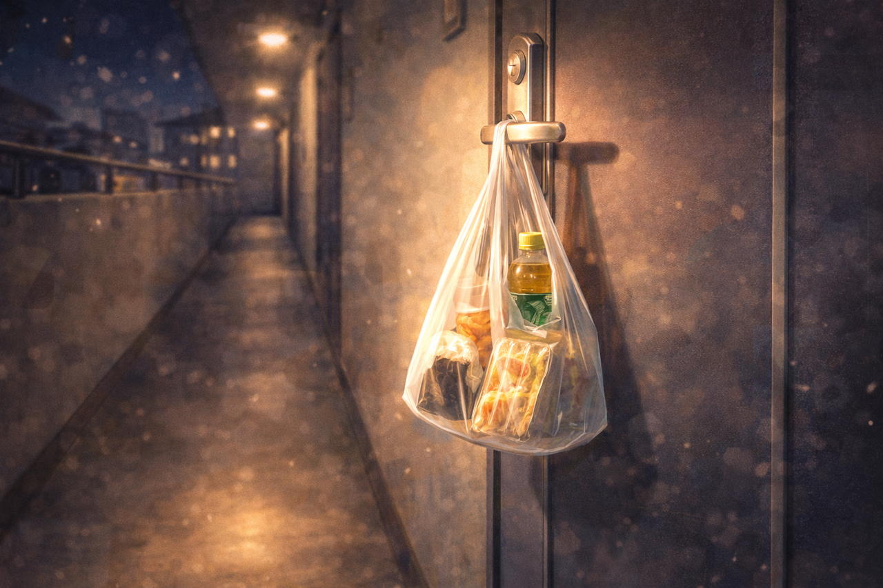 相当お疲れだろうし、帰りにコンビニ寄るような気力さえ無いだろうから、夜食と飲み物をドアノブにかけておいた。